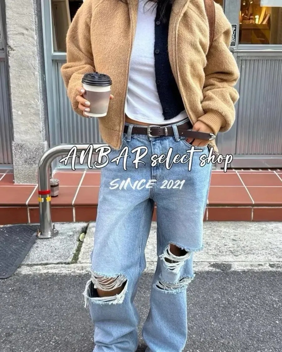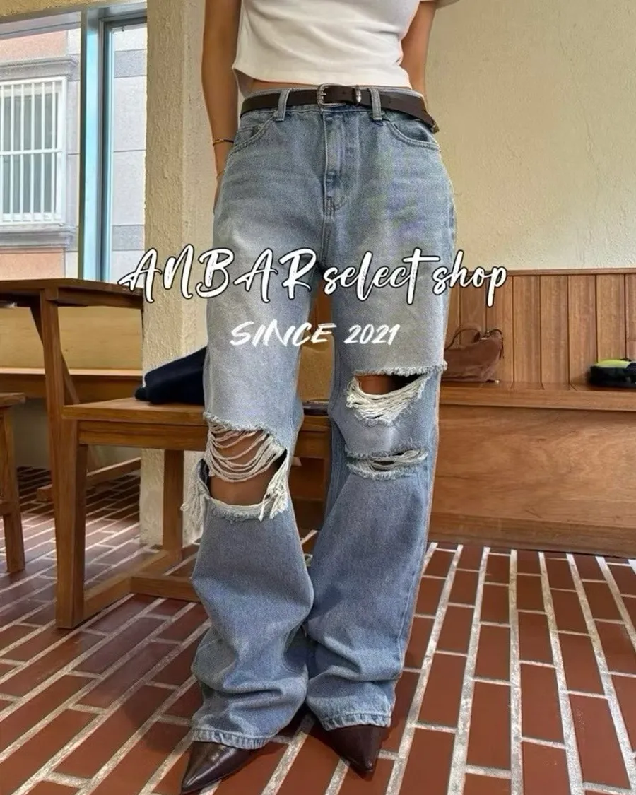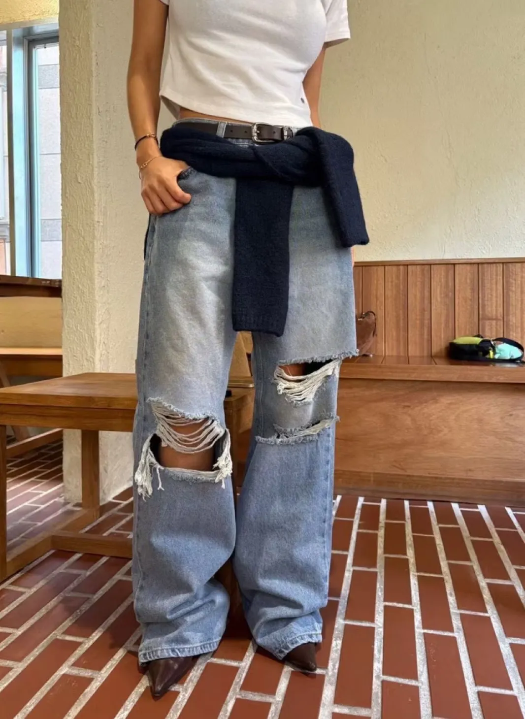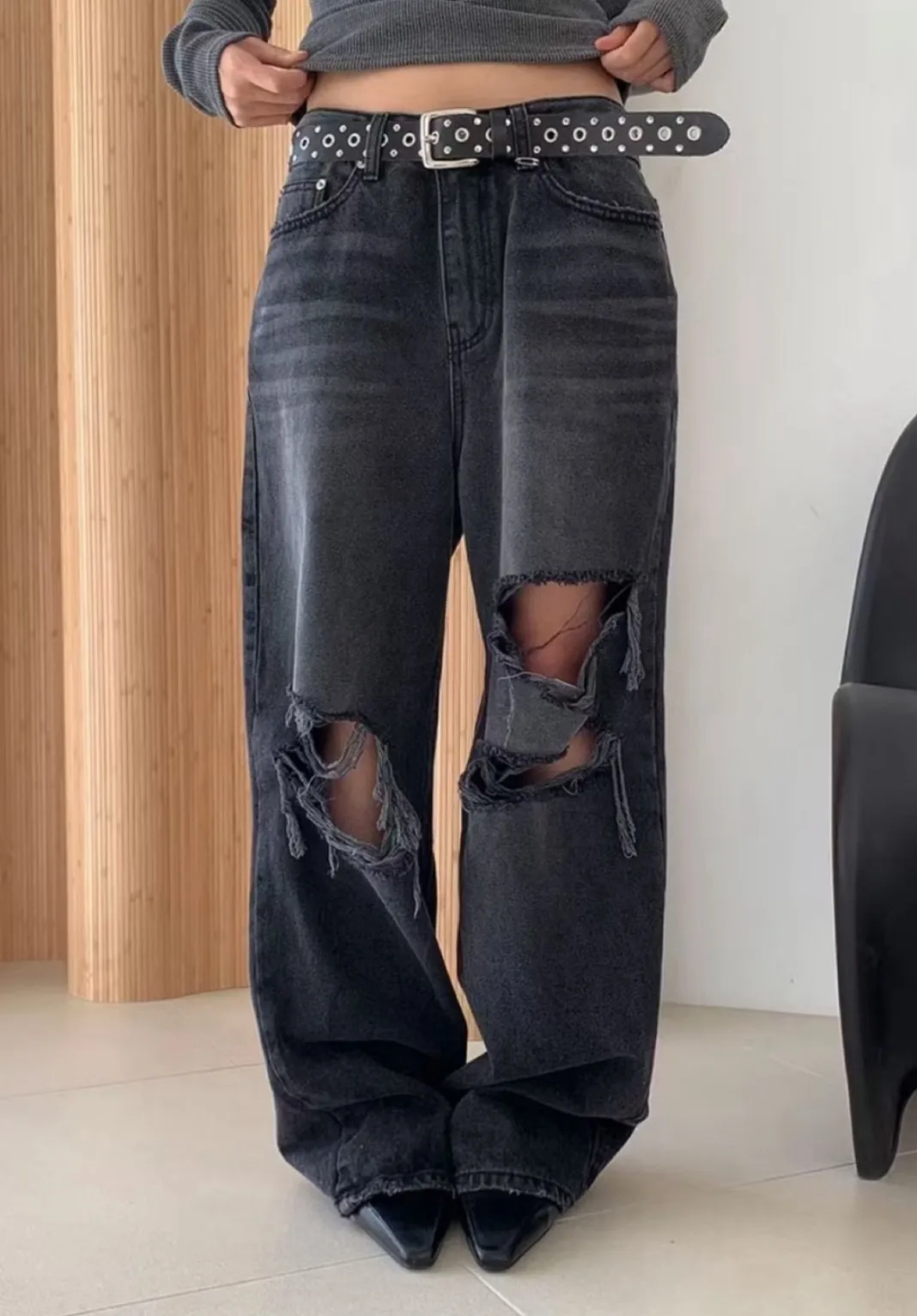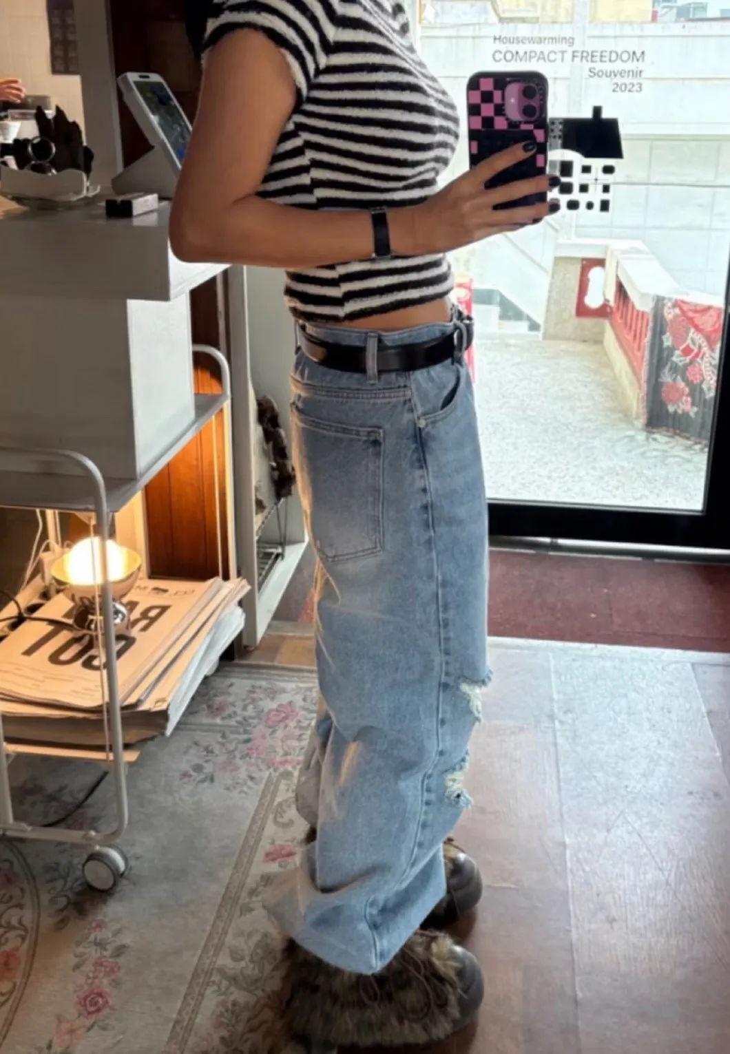 寬褲版型搭配不對稱刷破、破洞就是顯瘦,