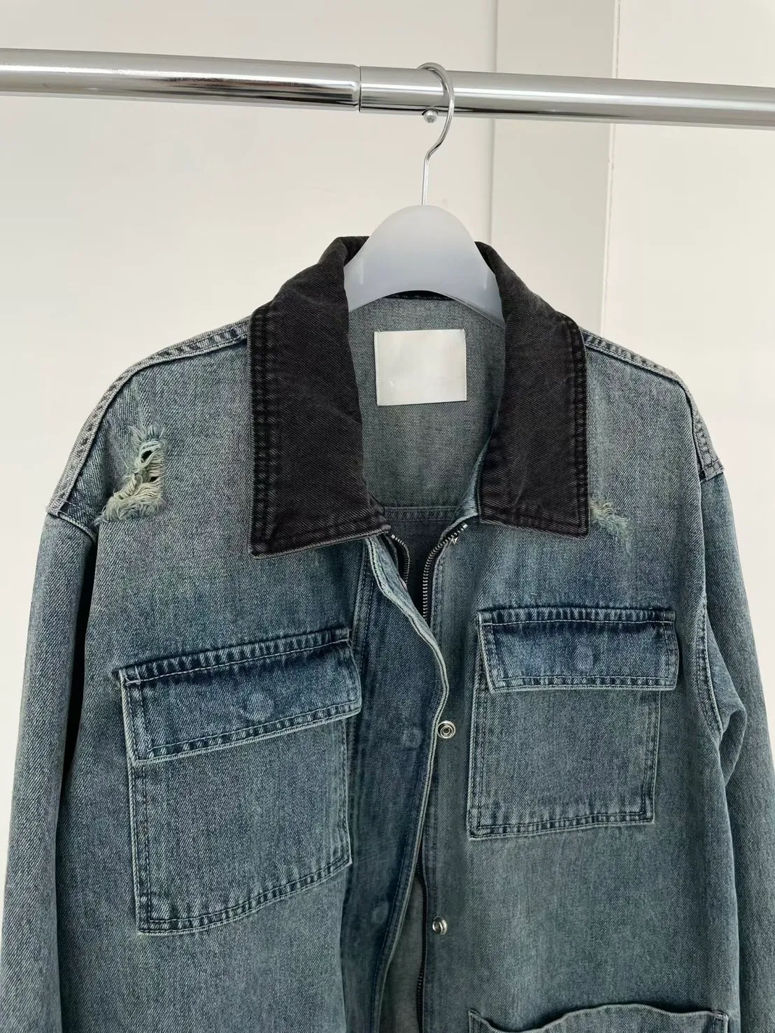 同材質的水洗黑撞色拼接翻領設計很好看~