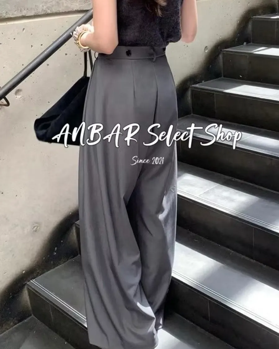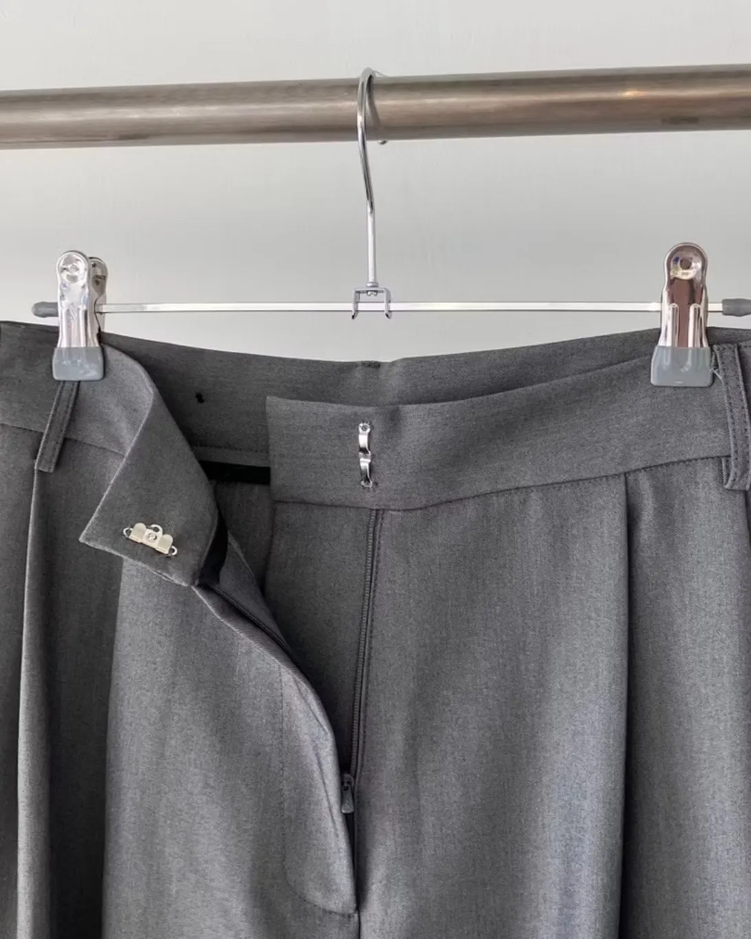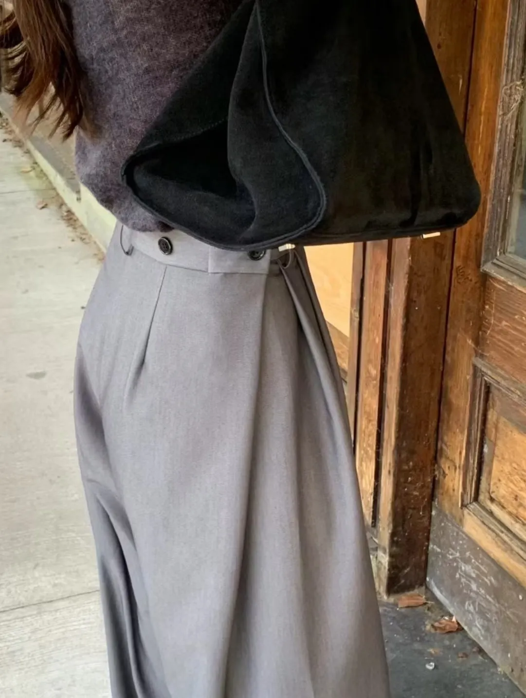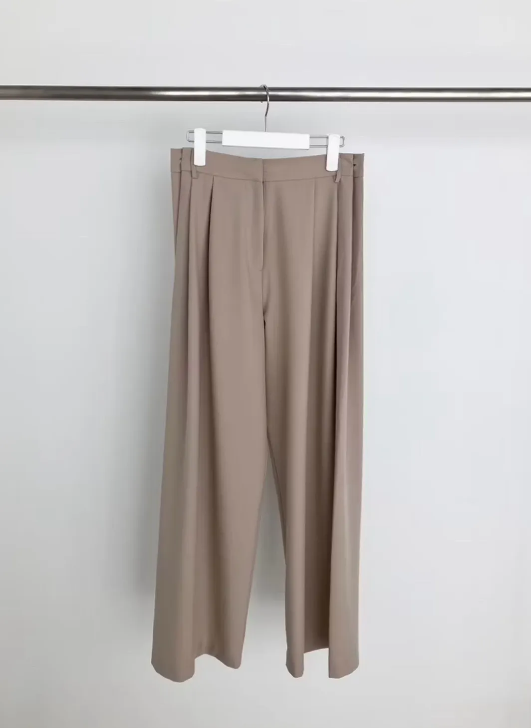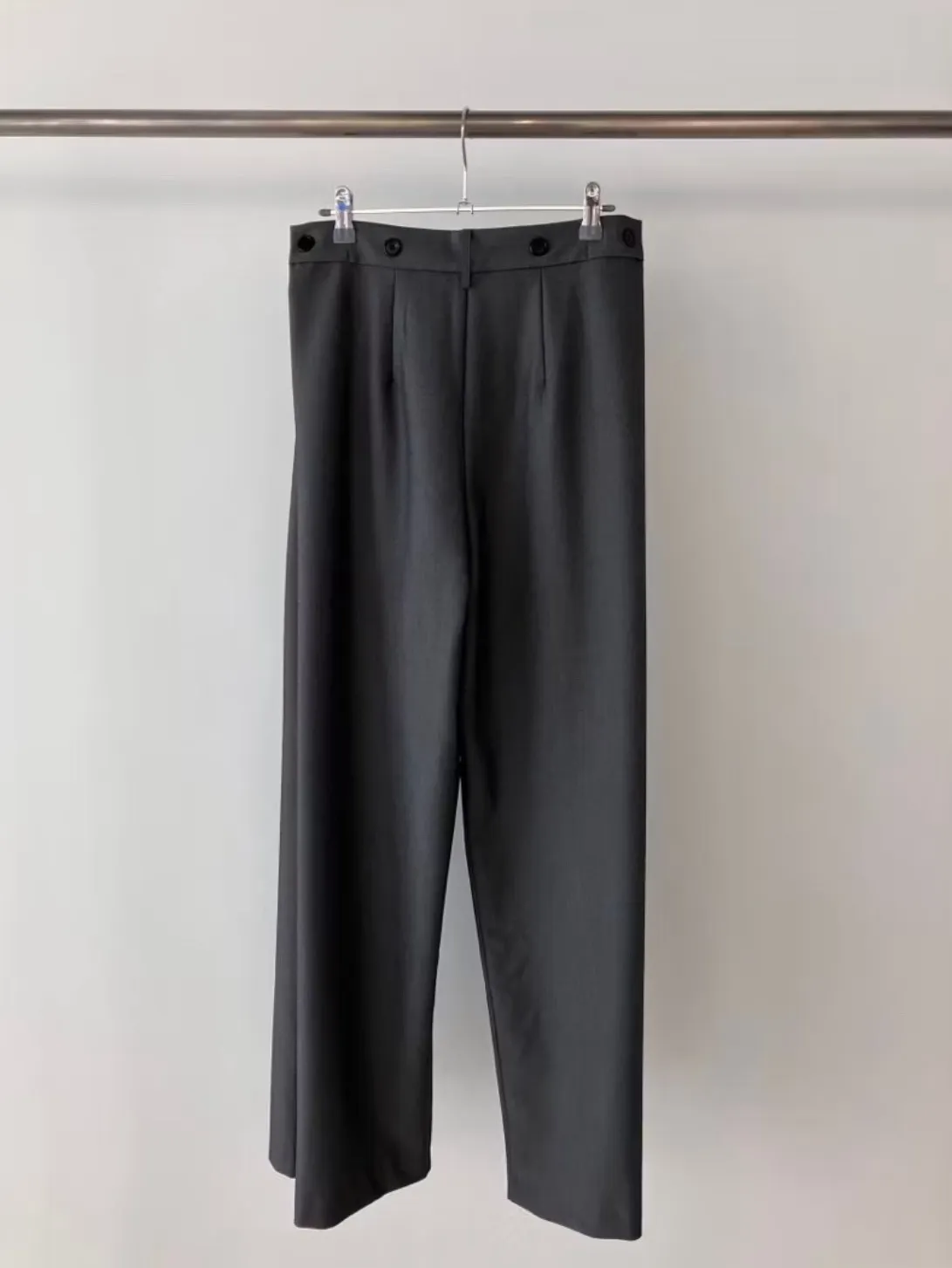 前面抓褶、後側鈕釦比較偏裝飾性質,有闊腿效果,