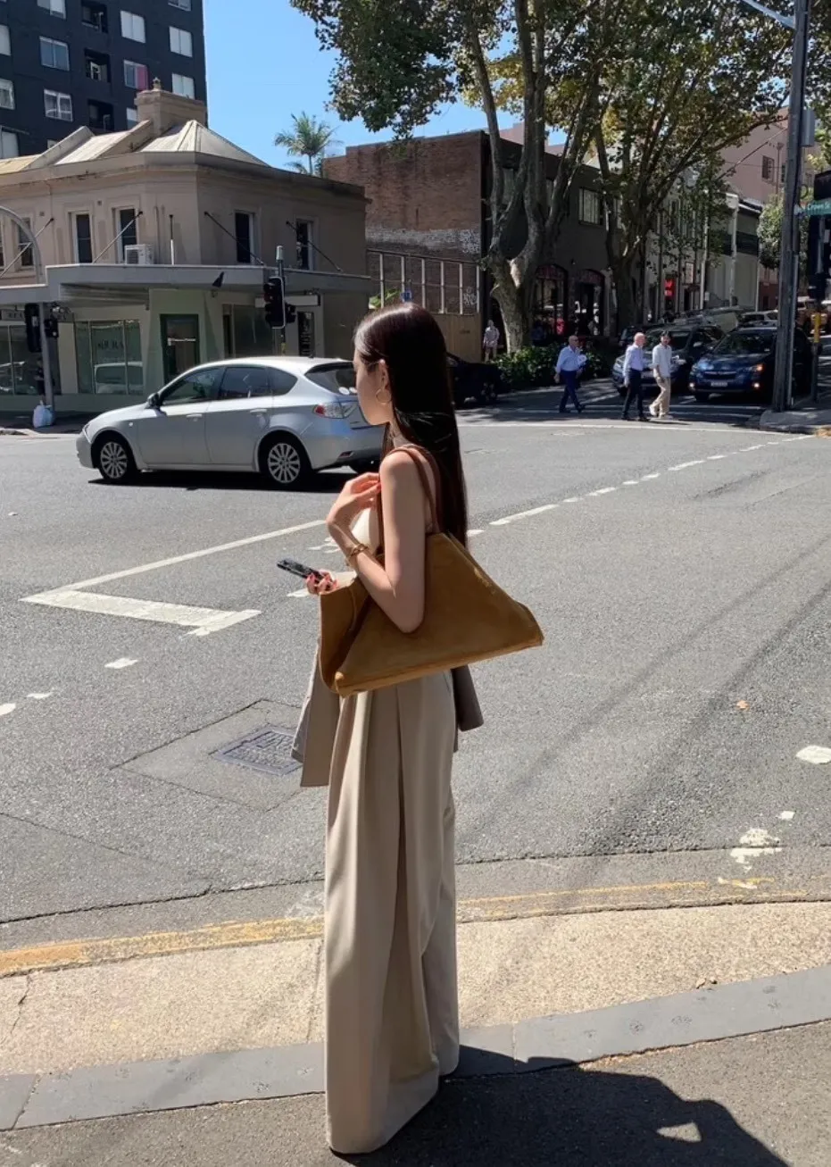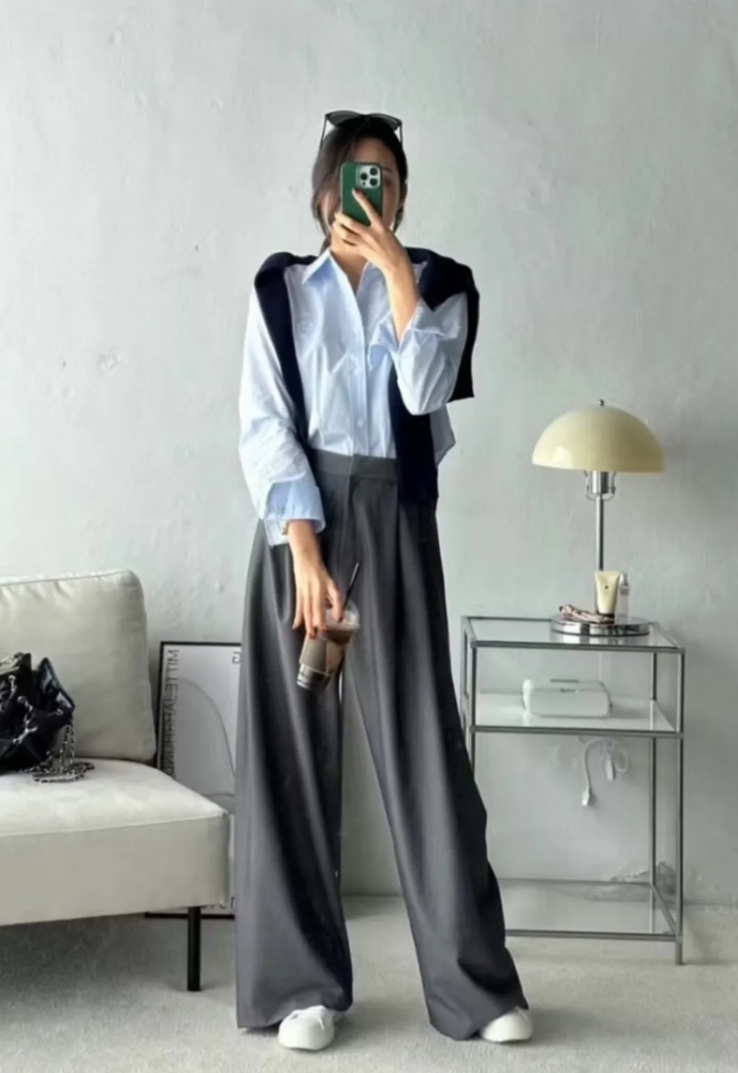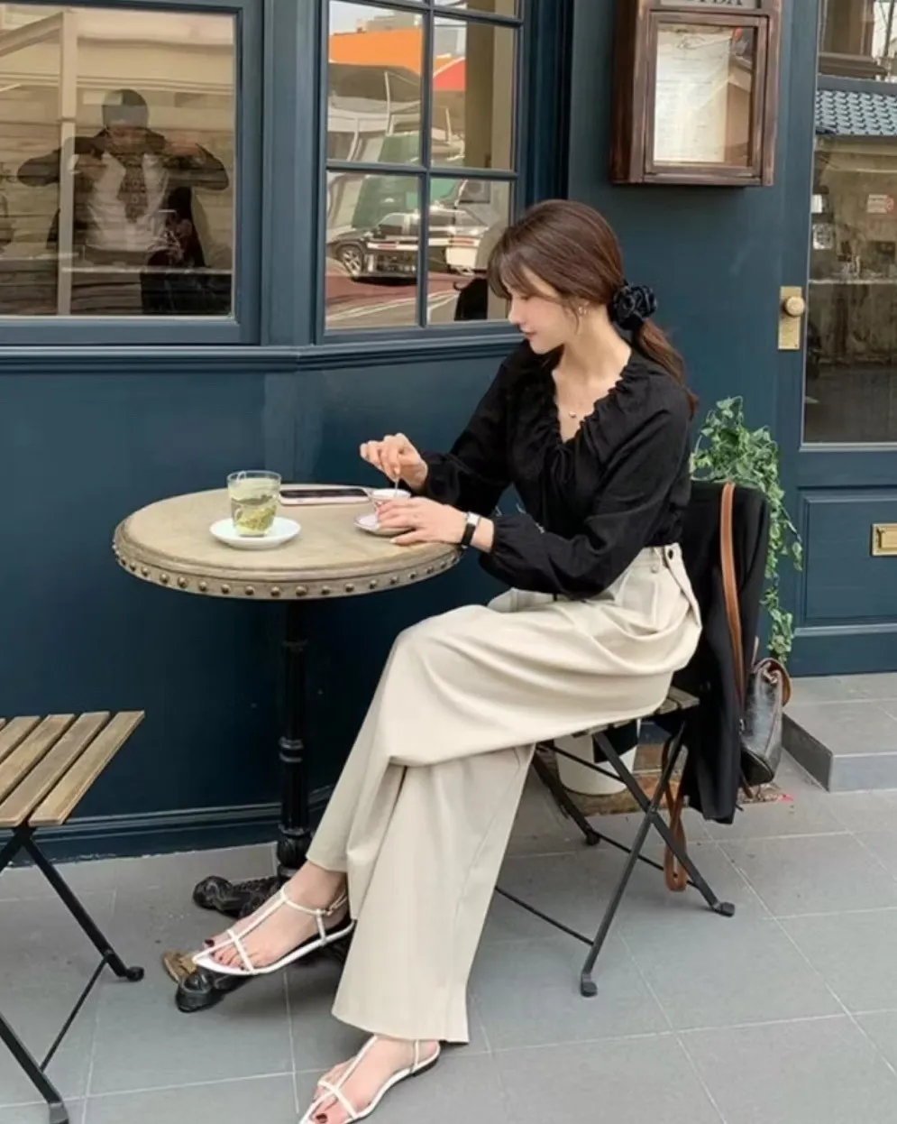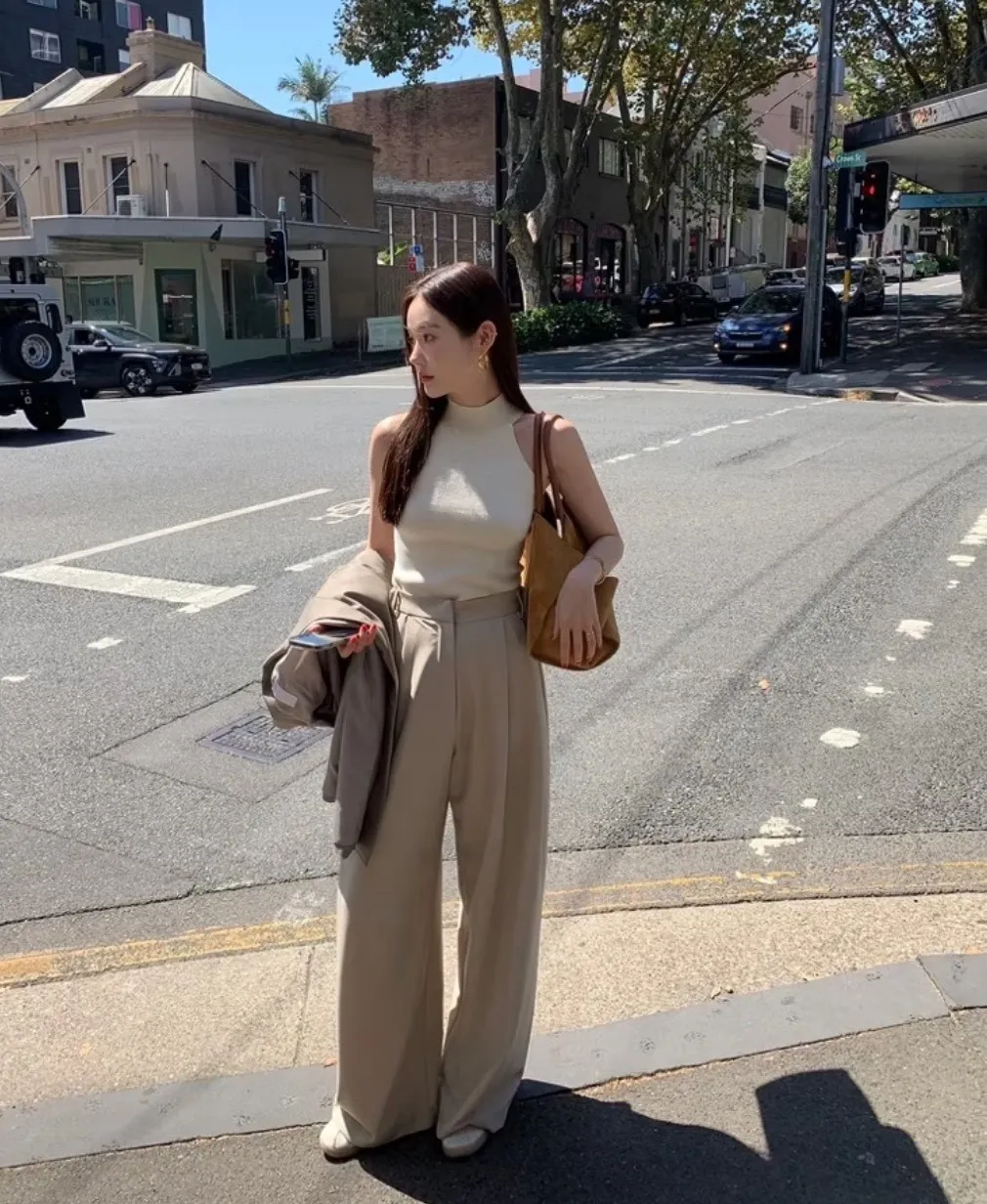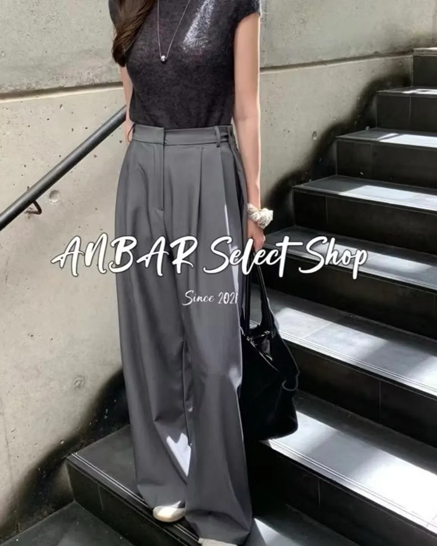 前面抓褶、後側鈕釦比較偏裝飾性質,有闊腿效果,