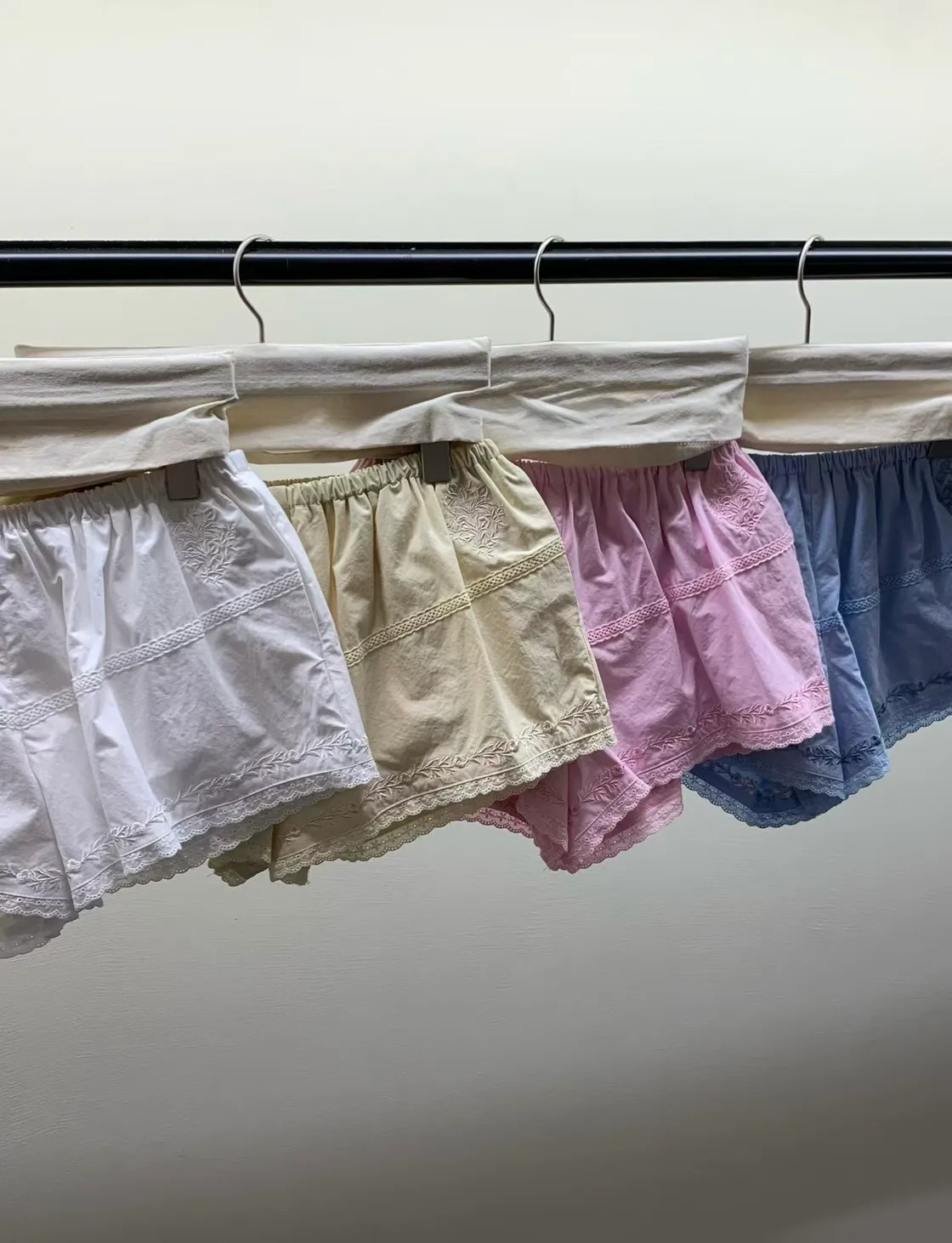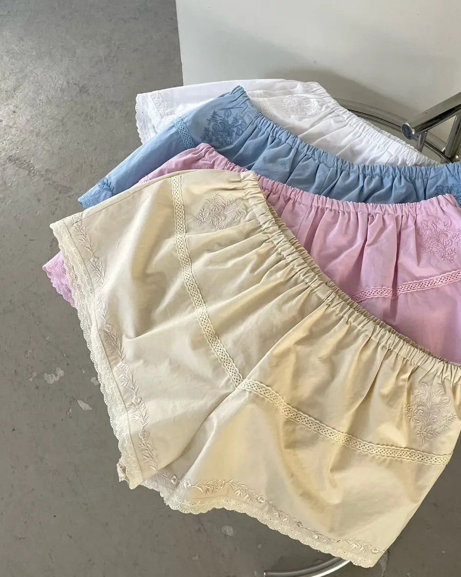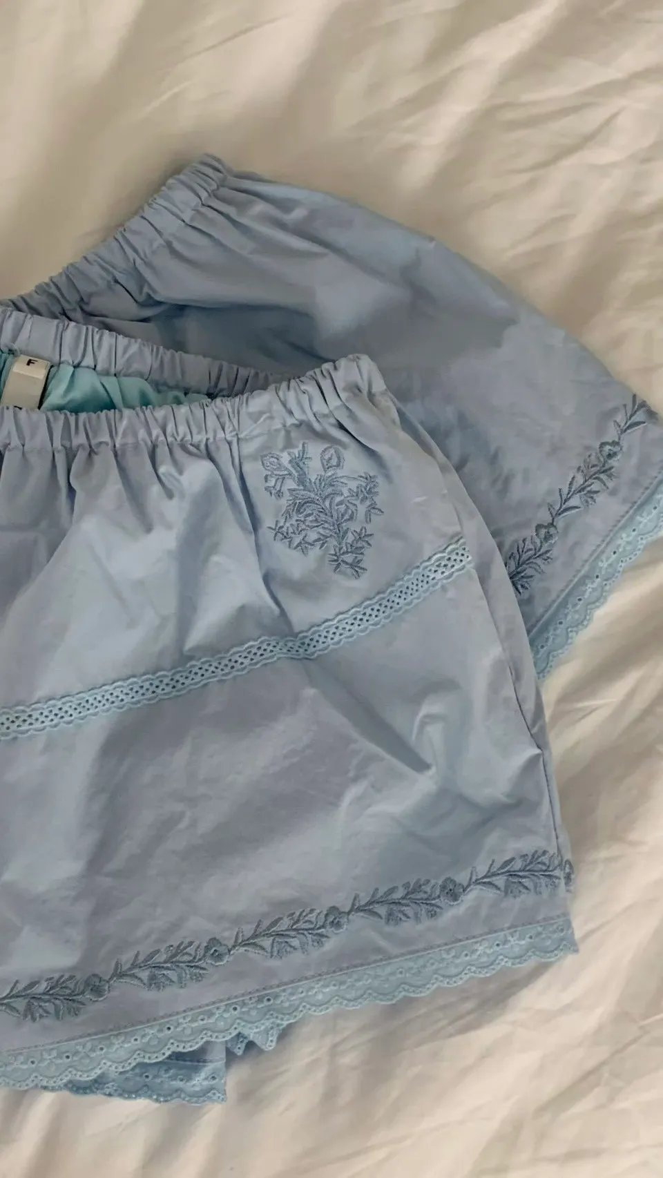 精緻的刺繡花朵點綴、布蕾絲褲管滾邊設計,