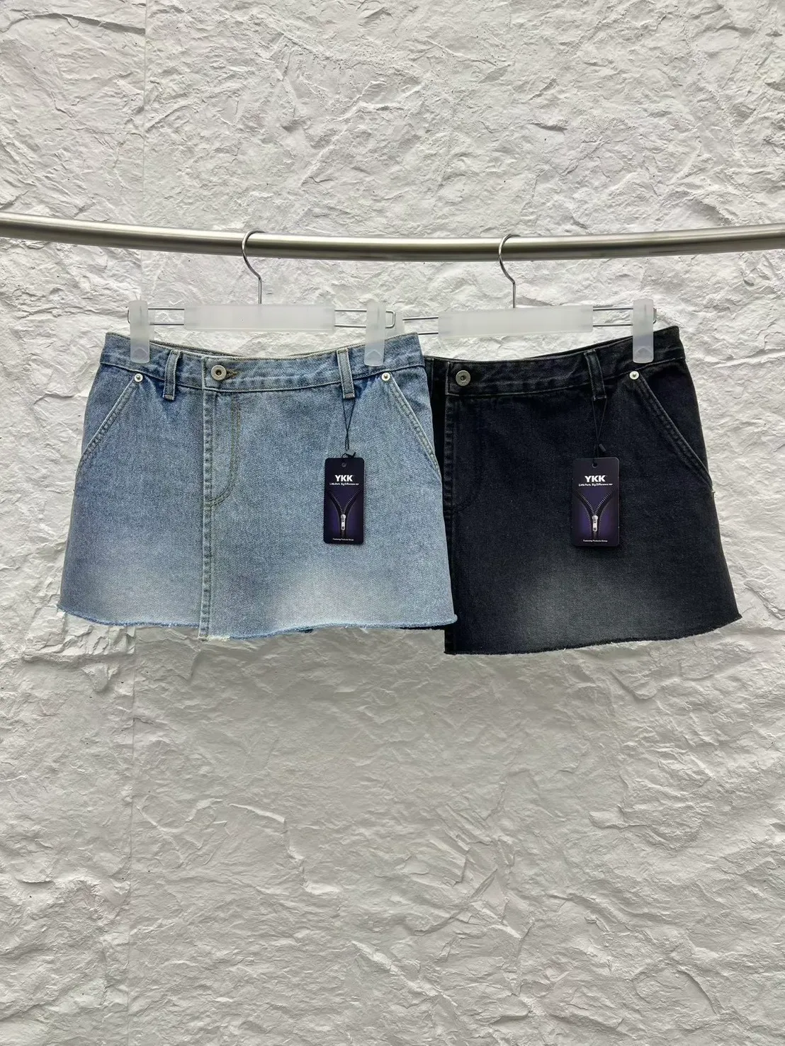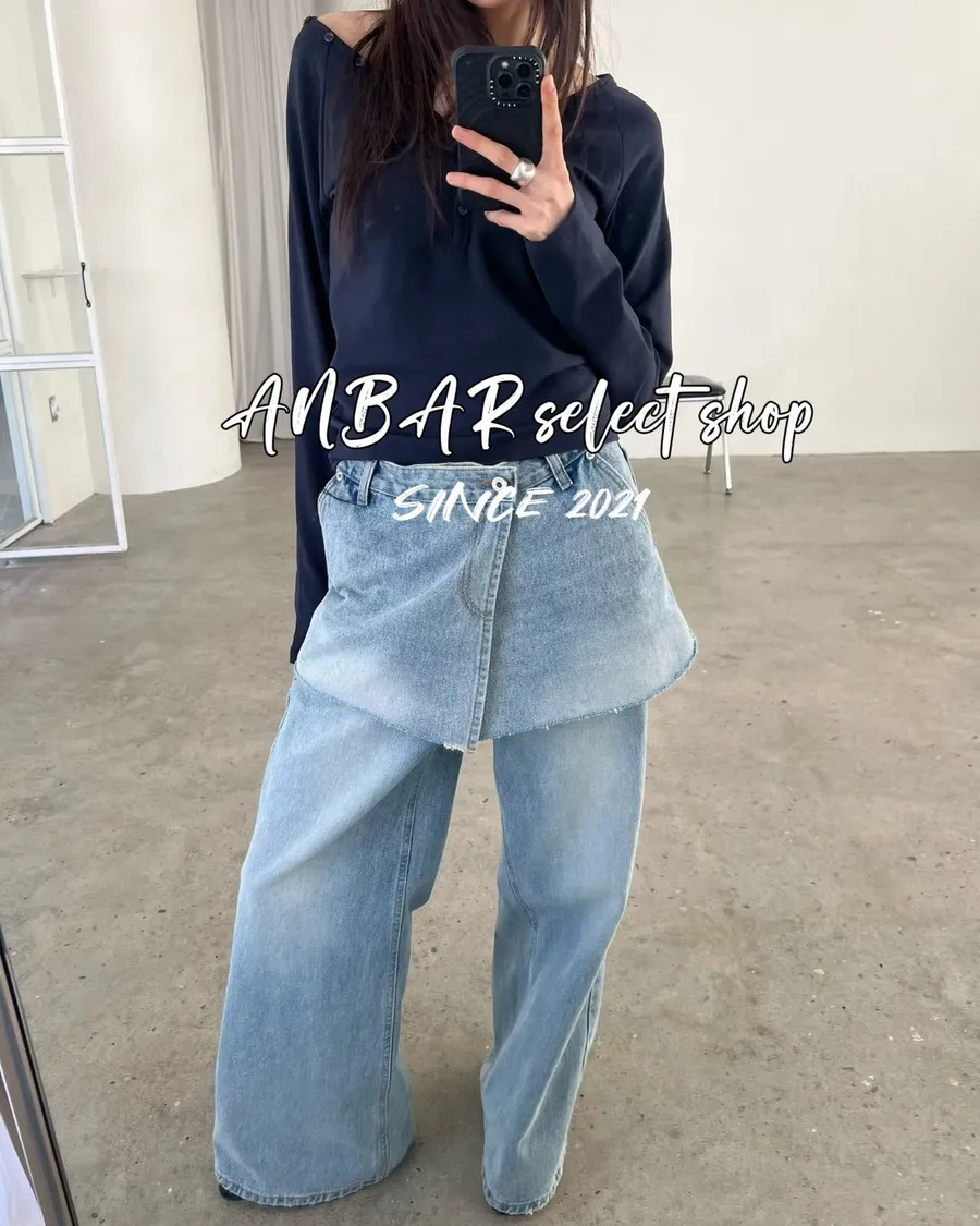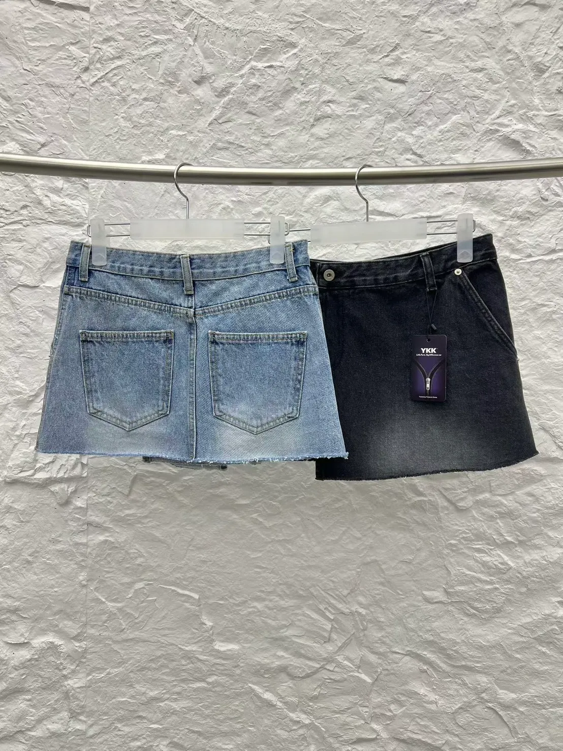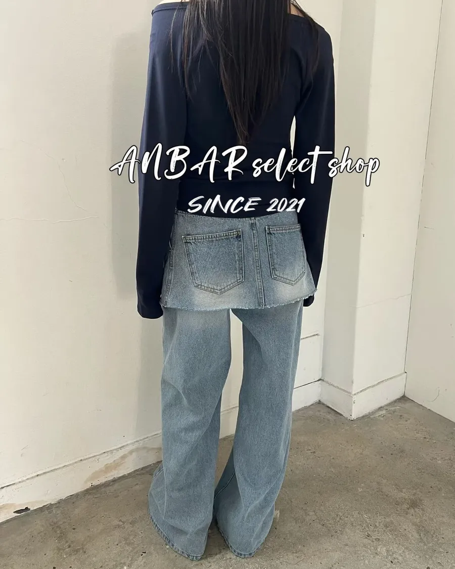 這款牛仔短裙是側開衩外罩裙形式,