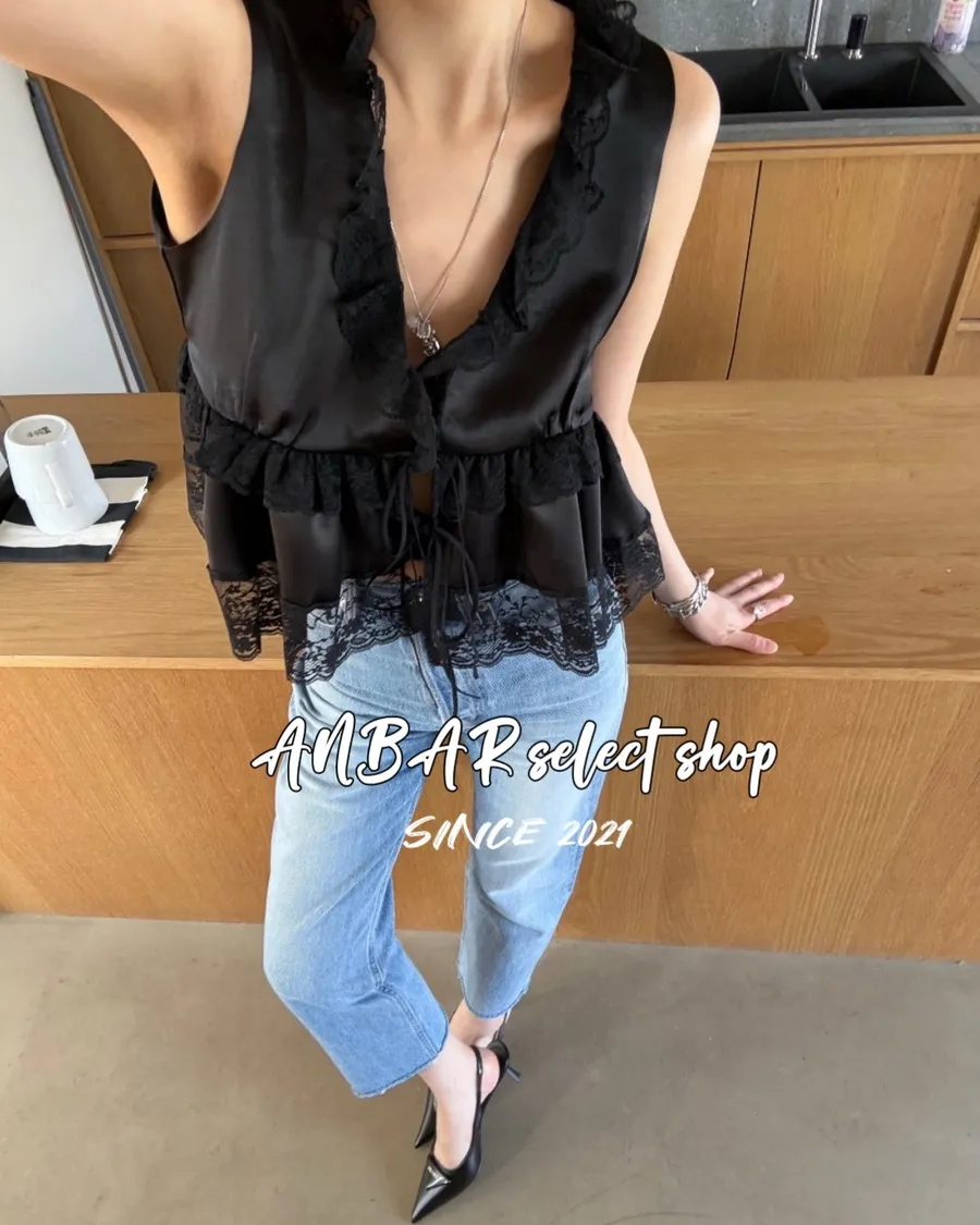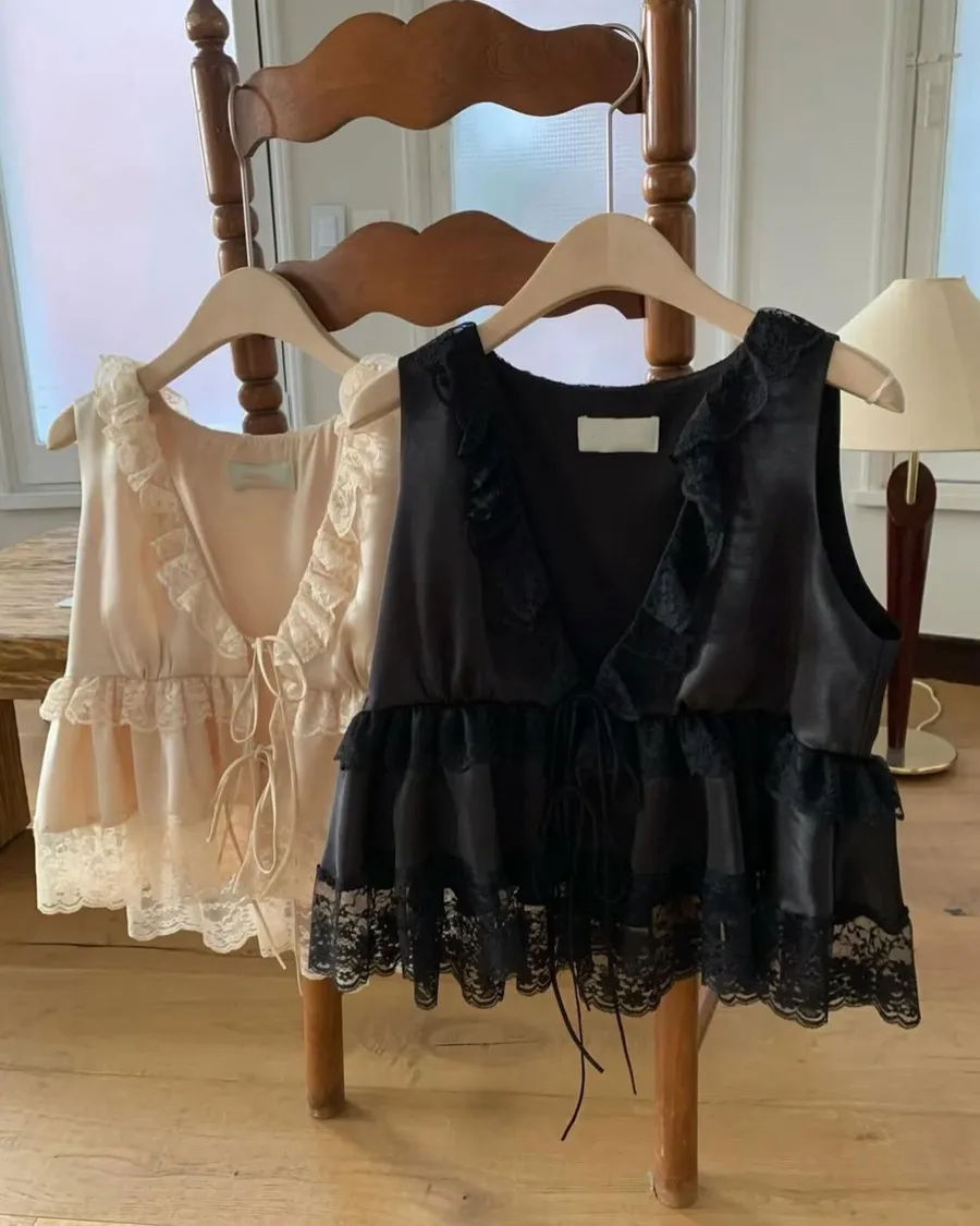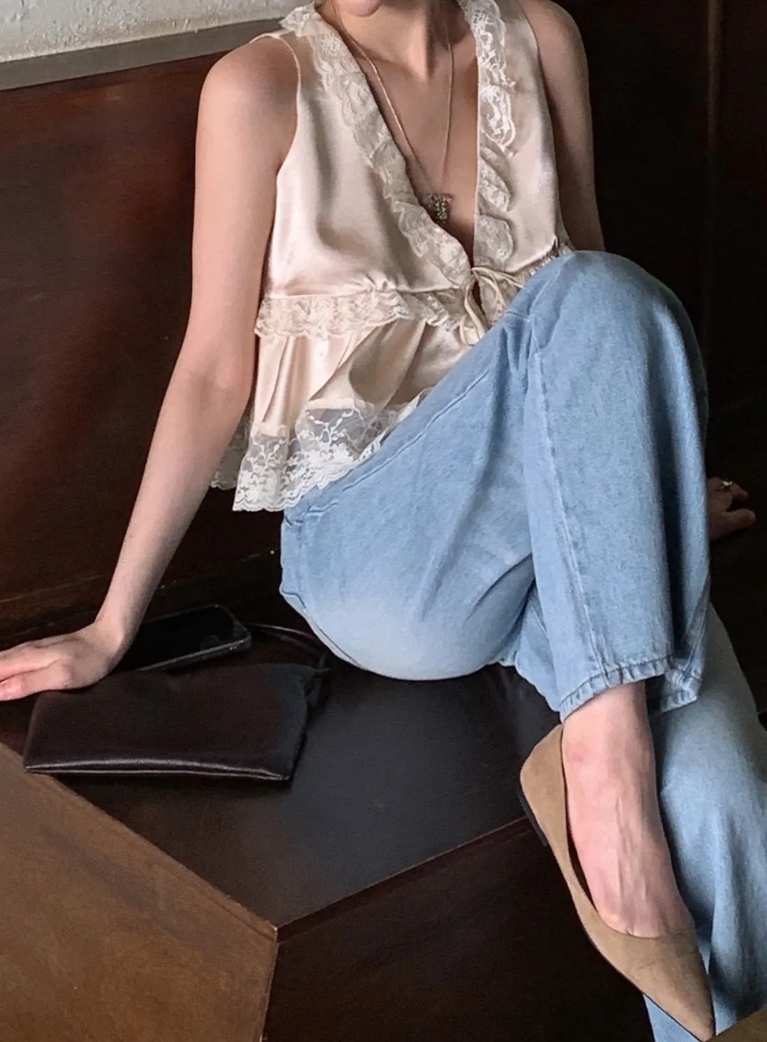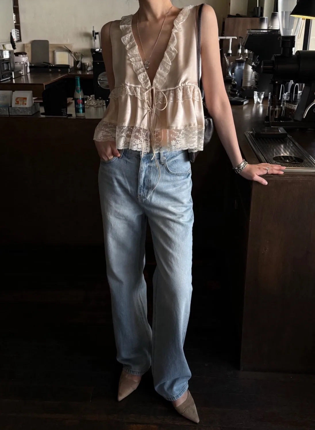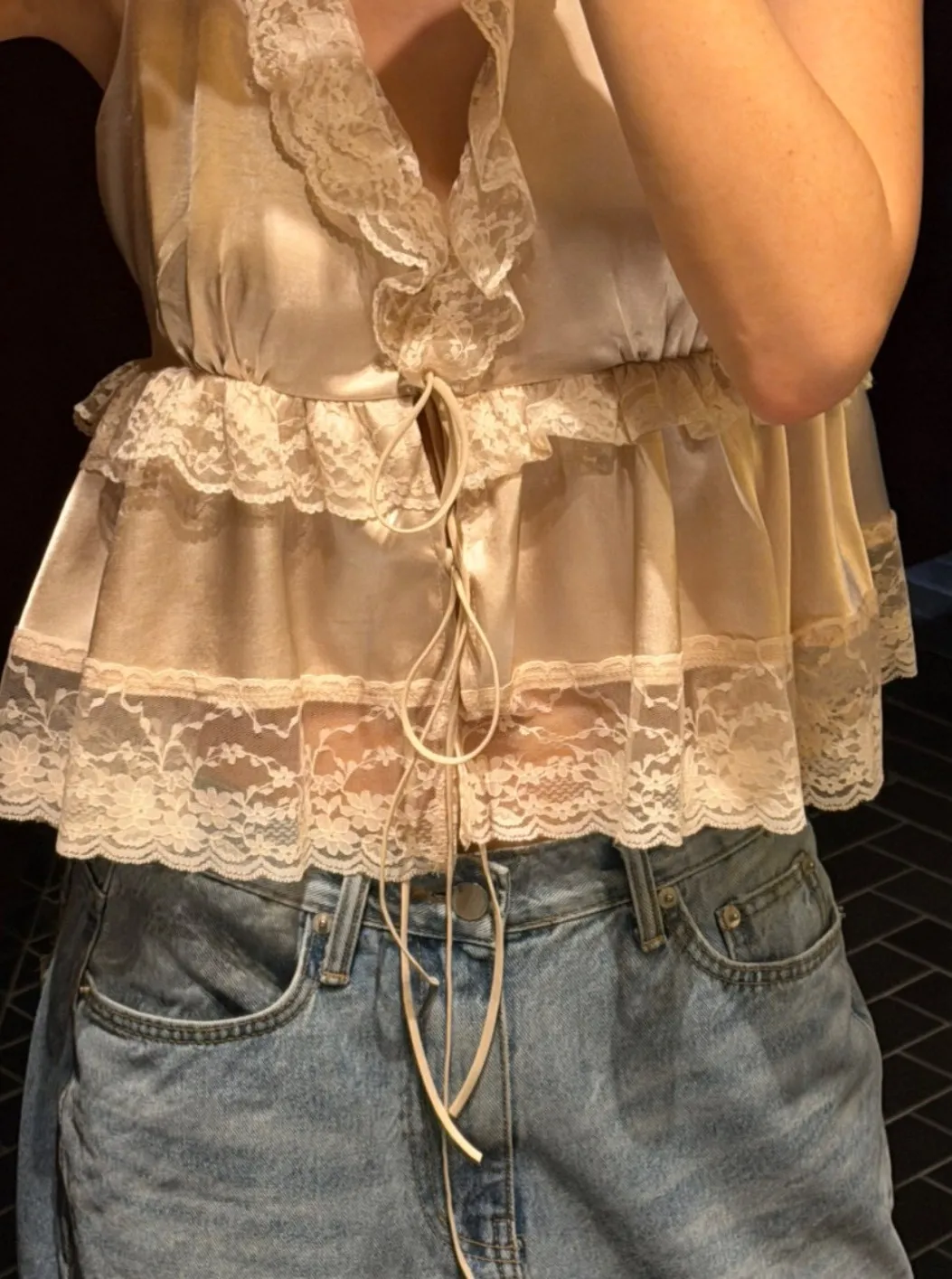 深V領、胸下也有蕾絲滾邊點綴,
